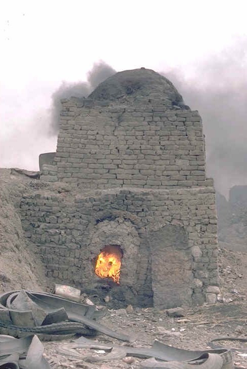 Fustat during firing: this is the back of the kiln in the previous photo, but here we see the stoke hole where the fuel is thrown in to sustain the firing. Notice that bits of rubber tyre are used as fuel. |