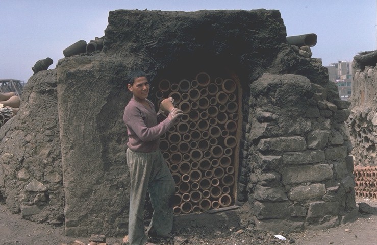 A young boy in Fustat carefully loads jars into a kiln for firing.