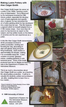 potter. In this film Alan Caiger-Smith demonstrates all the processes involved in pottery production: working and throwing the clay; decorating in slips and glazes; firing and post-firing treatments. Each section is approximately 30 minutes, making it an accessible study film. It also contains on-screen glossary entries, enabling students to note technical terms. Three of the bowls produced here are on display as teaching aids in the Department of Eastern Art, Ashmolean Museum. This is as much a documentary about Alan Caiger-Smith as a potter, as a teaching film about pottery production. It will be invaluable for students, potters and professionals alike, enabling them to learn from a true master. |
